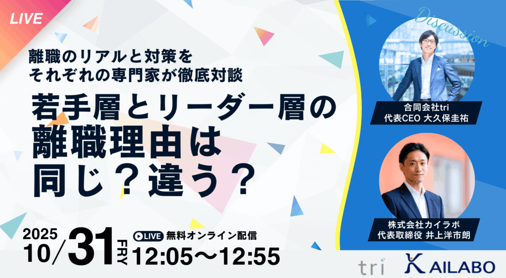 【10/31開催】離職のリアルと対策をそれぞれの専門家が徹底対談『若手層とリーダー層の移植理由は同じ?違う?』無料ウェビナーを開催します!